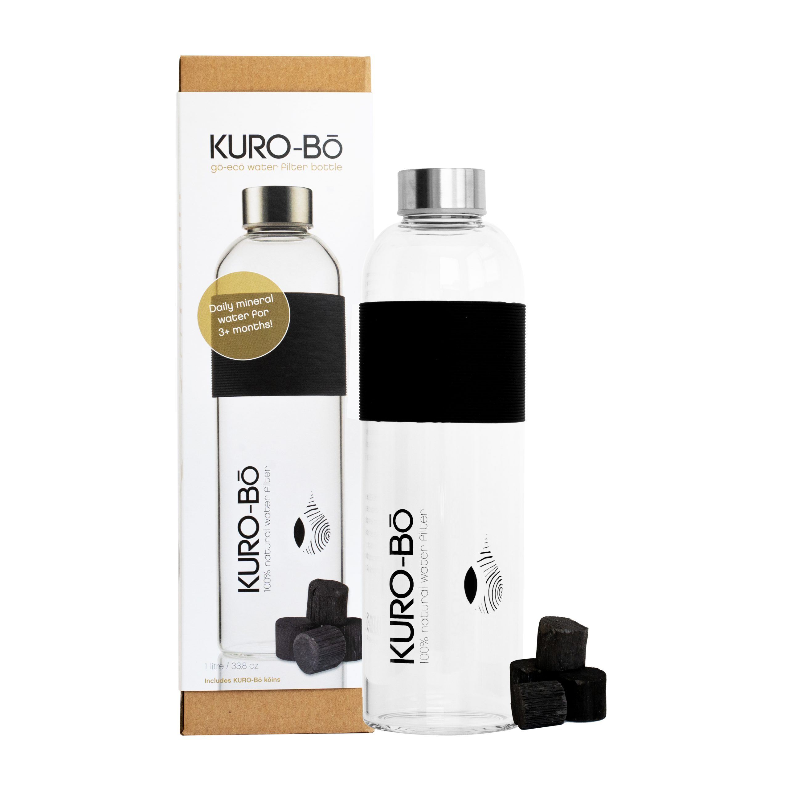 - Includes 1 pack of KURO-Bō Activated Charcoal Kōins for 3+ months of daily naturally filtered water, wherever you are!